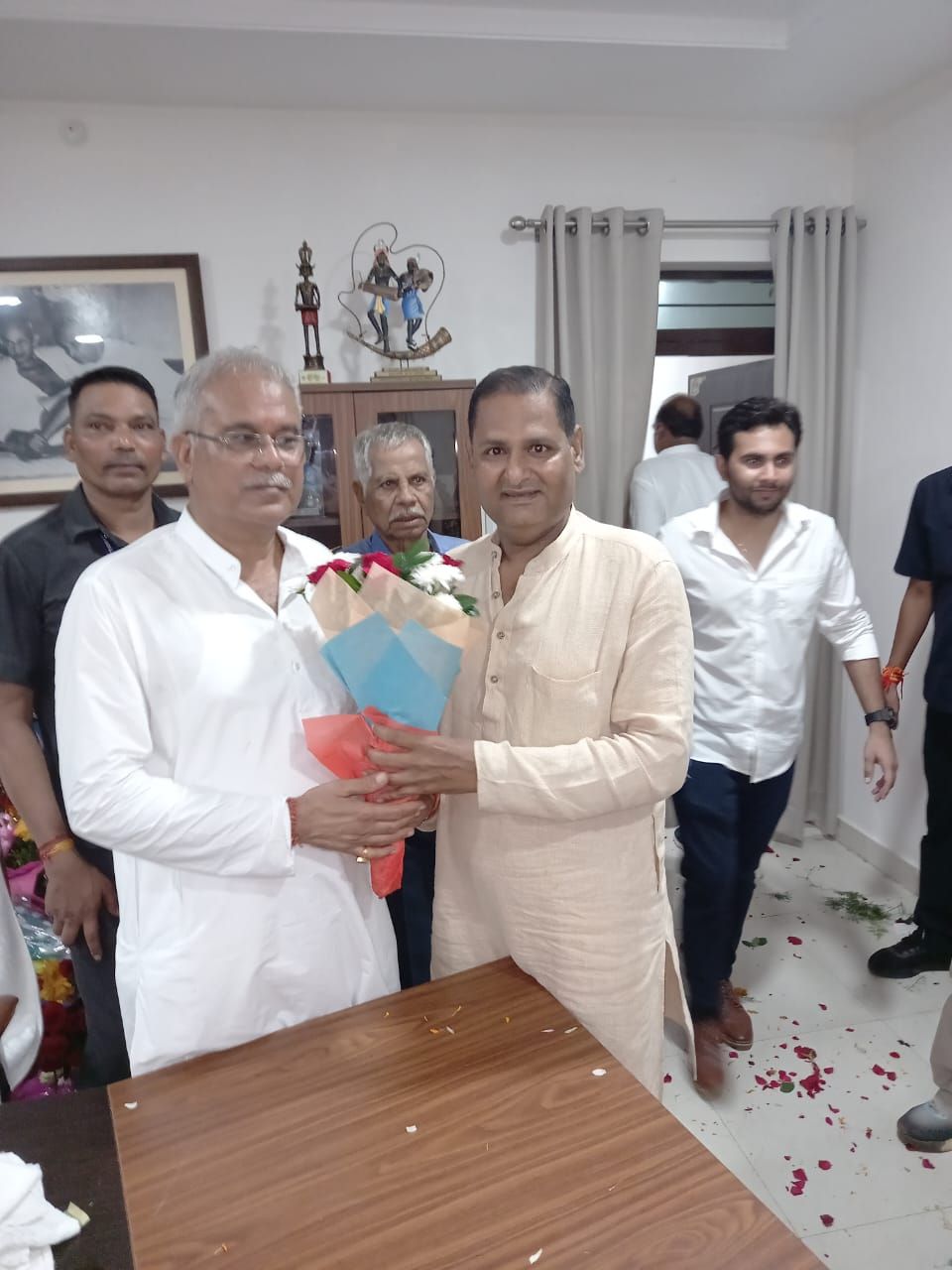 छत्तीसगढ के पुर्व मुख्यमंत्री भुपेश बघेल जी को उनके जन्मदिन के अवसर पर छत्तीसगढ योग आयोग के पुर्व सदस्य रविन्द्र सिंह जी और साथीगढ़ द्वारा पुष्प गुच्छ भेंट कर जन्मदिन की दी बधाई