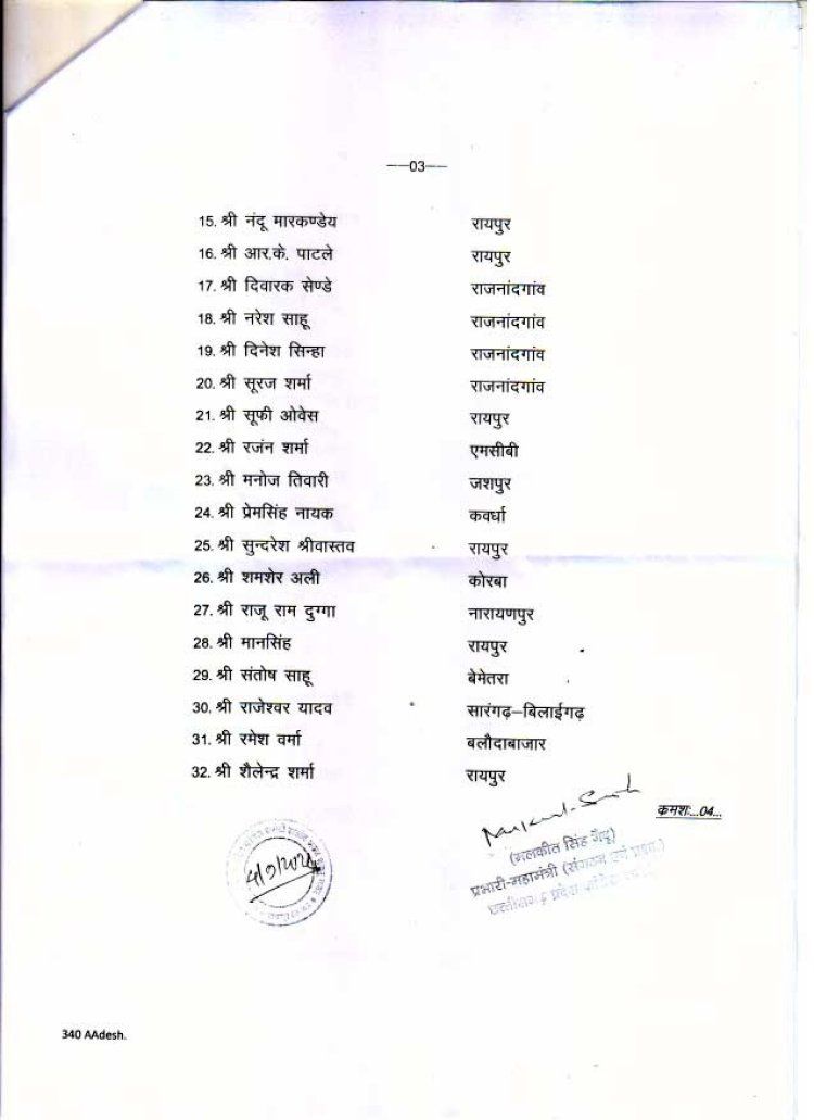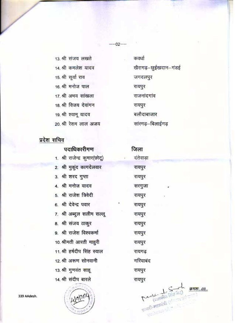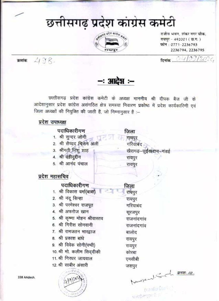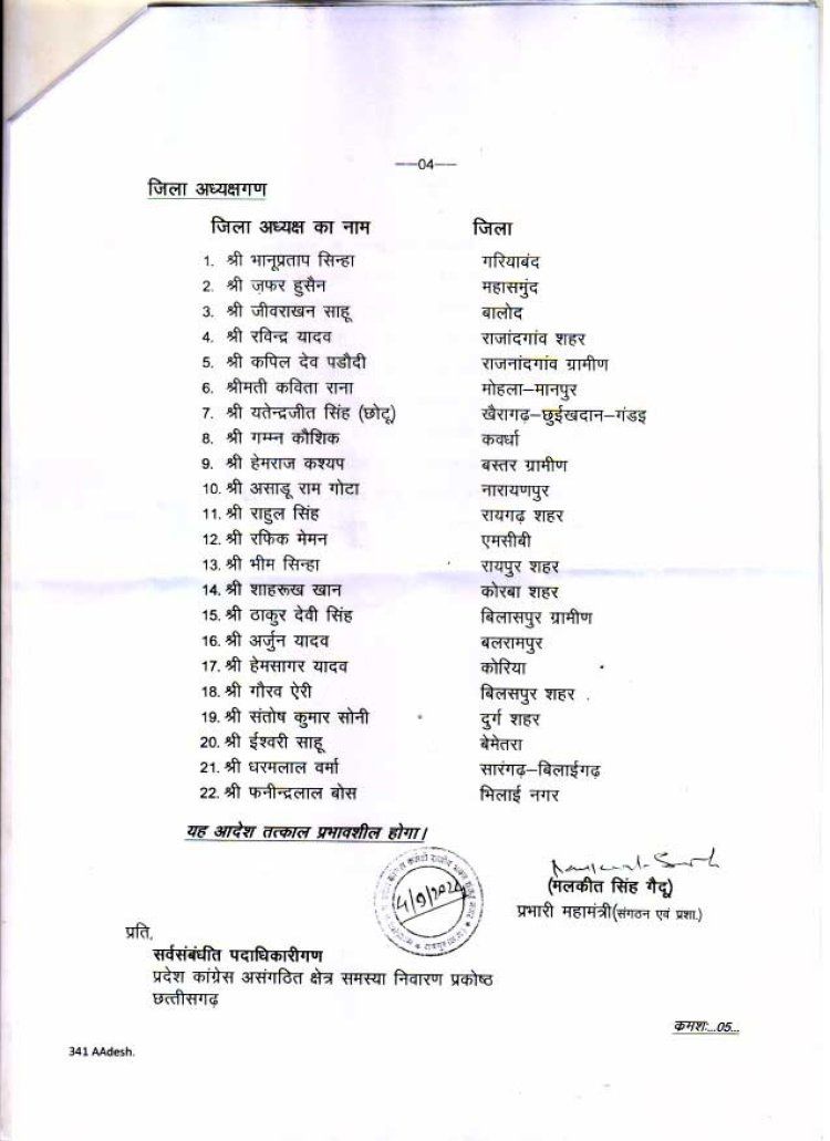 रायपुर। 22 जिले के जिला अध्यक्ष बदले गए पीसीसी चीफ दीपक बैच की टीम में नए चेहरों को मिला मौका। देखिए लिस्ट