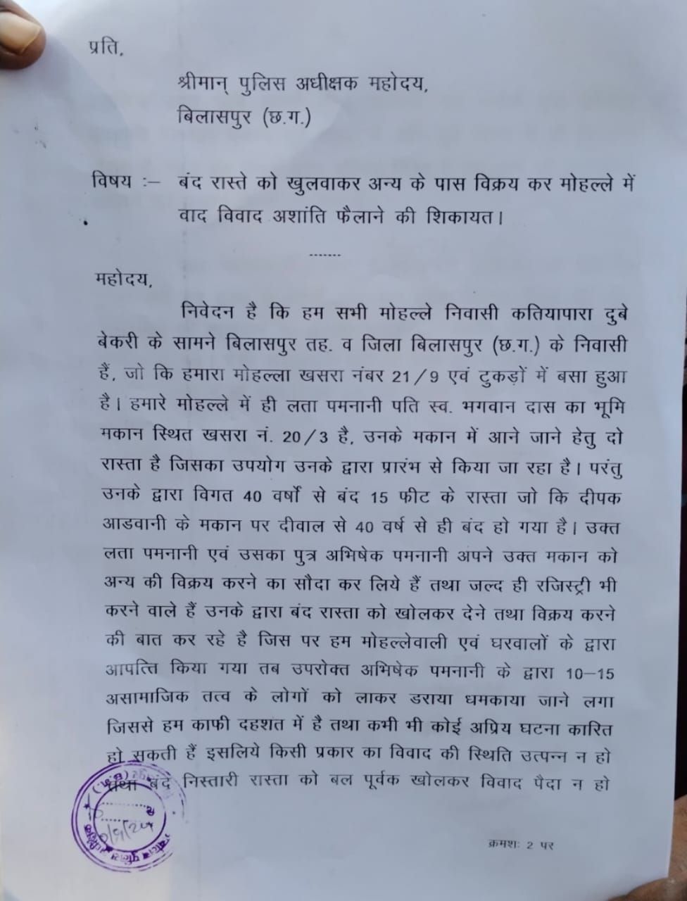 दरअसल यह पूरा मामला बिलासपुर के कतियापारा का है। यहां के रहवासियों ने पुलिस अधीक्षक को आवेदन दिया है कि “हम सभी मोहल्ले निवासी कतियापारा दुबे बेकरी के सामने बिलासपुर तह. व जिला बिलासपुर (छ.ग.) के निवासी हैं, जो कि हमारा मोहल्ला खसरा नंबर 21 / 9 एवं टुकड़ों में बसा हुआ है । हमारे मोहल्ले में ही लता पमनानी पति स्व. भगवान दास का भूमि मकान स्थित खसरा नं. 20/3 है, उनके मकान में आने जाने हेतु दो रास्ता है जिसका उपयोग उनके द्वारा प्रारंभ से किया जा रहा है। परंतु उनके द्वारा विगत 40 वर्षों से बंद 15 फीट के रास्ता जो कि दीपक आडवानी के मकान पर दीवाल से 40 वर्ष से ही बंद हो गया है। उक्त लता पमनानी एवं उसका पुत्र अभिषेक पमनानी अपने उक्त मकान को अन्य की विक्रय करने का सौदा कर लिये हैं तथा जल्द ही रजिस्ट्री भी करने वाले हैं उनके द्वारा बंद रास्ता को खोलकर देने तथा विक्रय करने की बात कर रहे है