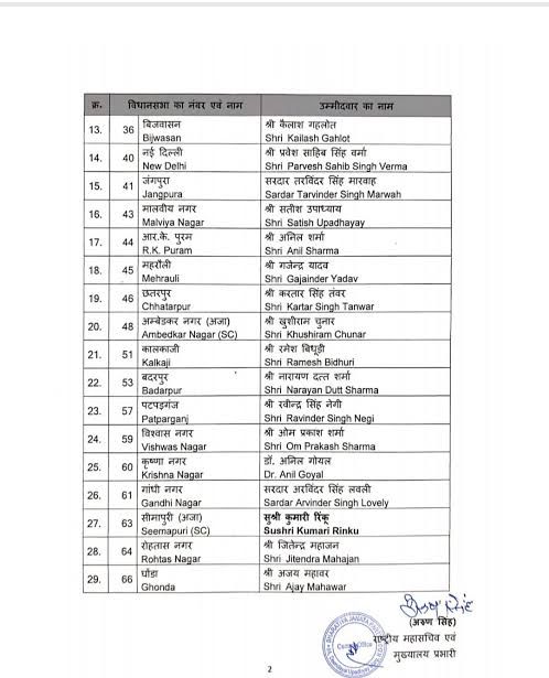 इसके अलावा, नई दिल्ली से प्रवेश साहिब सिंह वर्मा, जंगपुरा से सरदार तरविंदर सिंह, मालवीय नगर से सतीश उपाध्याय, आरके पुरम सीट से अनिल शर्मा, महरौली से गजेंद्र यादव, छतरपुर से करतार सिंह तंवर, अंबेडकर नगर से खुशीराम चुनार, कालकाजी से रमेश बिधूड़ी, बदरपुर से नारायण दत्त शर्मा, पटपड़गंज से रवींद्र सिंह नेगी, विश्वास नगर से ओम प्रकाश वर्मा, कृष्णा नगर से अनिल गोयल, गांधीनगर से अरविंदर सिंह लवली, सीमापुरी से कुमारी रिंकू, रोहतास नगर से जितेंद्र महाजन और घोंडा से अजय महावर को चुना गया है.