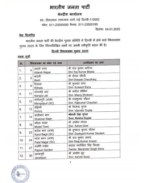 बीजेपी ने आदर्श नगर सीट से राजकुमार भाटिया, बादली से दीपक चौधरी, रिठाला से कुलवंत राणा, नांगलोई जाट सीट से मनोज शौकीन, मंगोलपुरी सीट से राजकुमार चौहान, रोहिणी से विजेंद्र गुप्ता, शालीमार बाग से रेखा गुप्ता, मॉडल टाउन सीट से अशोक गोयल, और मॉडल टाउन सीट से अशोक गोयल, करोल बाग से दुष्यंत कुमार गौतम, पटेल नगर से राजकुमार आनंद, राजौरी गार्डन से सरदार मनजिंदर सिंह सिरसा, जनकपुरी से आशीष सूद और बिजवासन सीट से कैलाश गहलोत को टिकट दिया गया है.