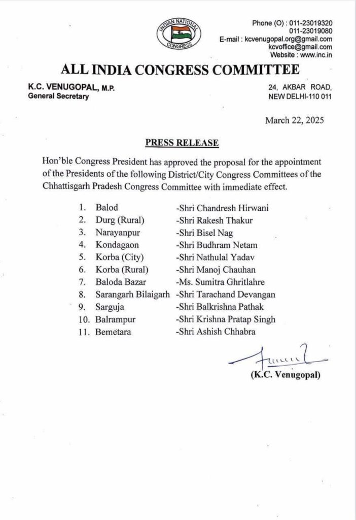 कांग्रेस संगठन में बड़ा फेरबदल, कई जिलों के जिला अध्यक्ष बदले गए , जानें किसे कहां का मिली जिम्मेदारी…