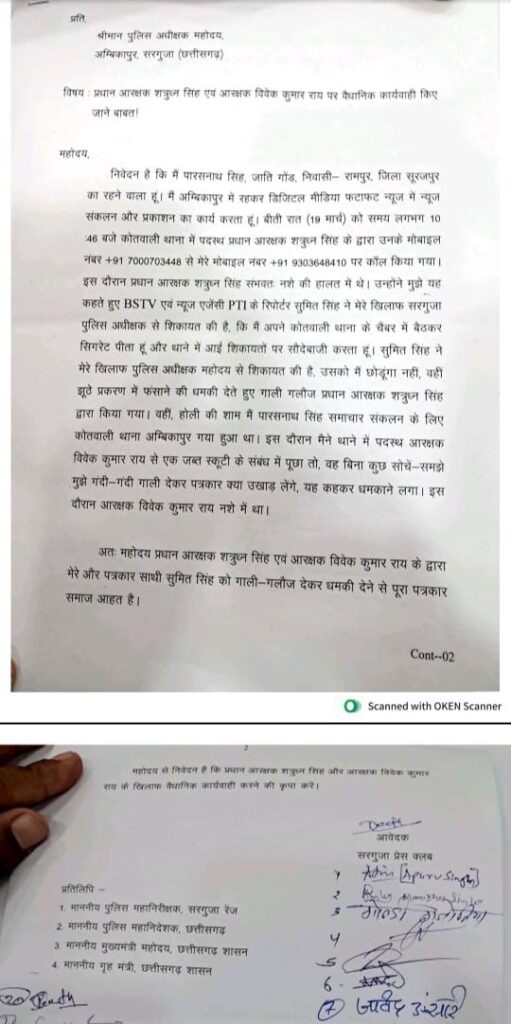 ऐसा ही मामला अम्बिकापुर से सामने आया है, जहां कोतवाली थाना में पदस्थ प्रधान आरक्षक शत्रुध्न सिंह ने पत्रकार सुमित सिंह को झूठे केस में फंसाने की धमकी देने के साथ ही गाली-गलौज की है। वहीं आरक्षक विवेक कुमार राय ने थाना परिसर में ही पत्रकार पारसनाथ सिंह के साथ दुर्व्यवहार किया है।