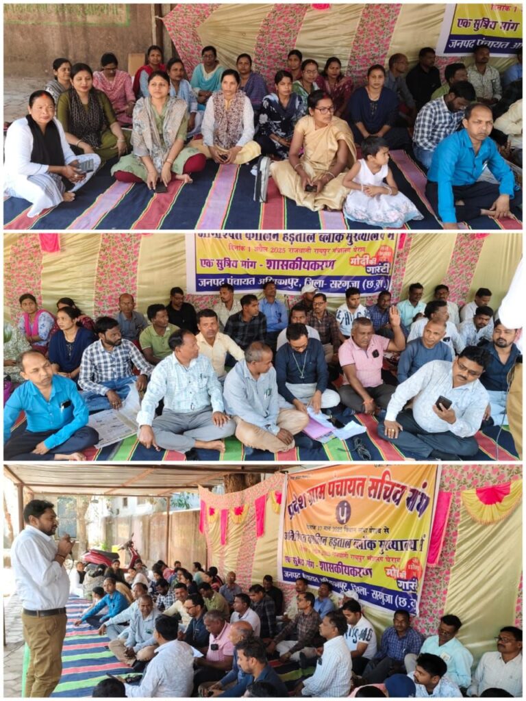 अम्बिकापुर, 24 मार्च 2025 – ग्राम पंचायत सचिवों की अनिश्चितकालीन हड़ताल के चलते ग्रामीण विकास के कई कार्य ठप हो गए हैं। सचिव संघ का कहना है कि सरकार ने ‘मोदी की गारंटी’ के तहत 100 दिनों के भीतर उनके शासकीयकरण का वादा किया था, लेकिन डेढ़ साल बीतने के बावजूद अब तक कोई ठोस पहल नहीं हुई है।