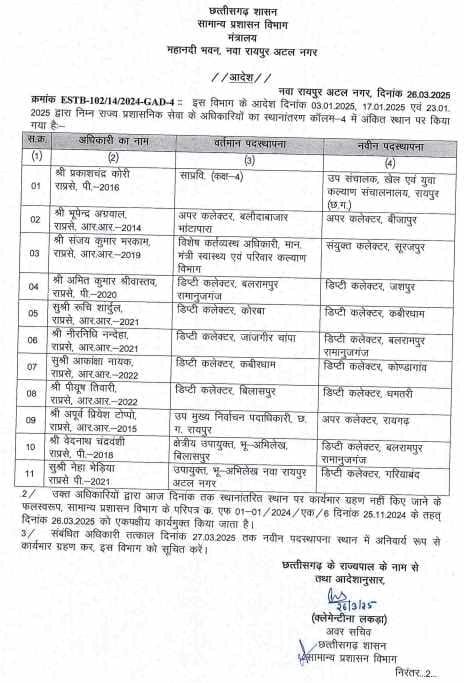 सरकार के सख्त निर्देश : महानदी भवन, नया रायपुर अटल नगर से जारी आदेश में कहा गया है कि स्थानांतरित अधिकारियों को 27 मार्च 2025 तक अपने नवीन पदस्थापना स्थल पर अनिवार्य रूप से कार्यभार ग्रहण करना होगा। अन्यथा, उनके खिलाफ आगे की अनुशासनात्मक कार्रवाई की जाएगी।