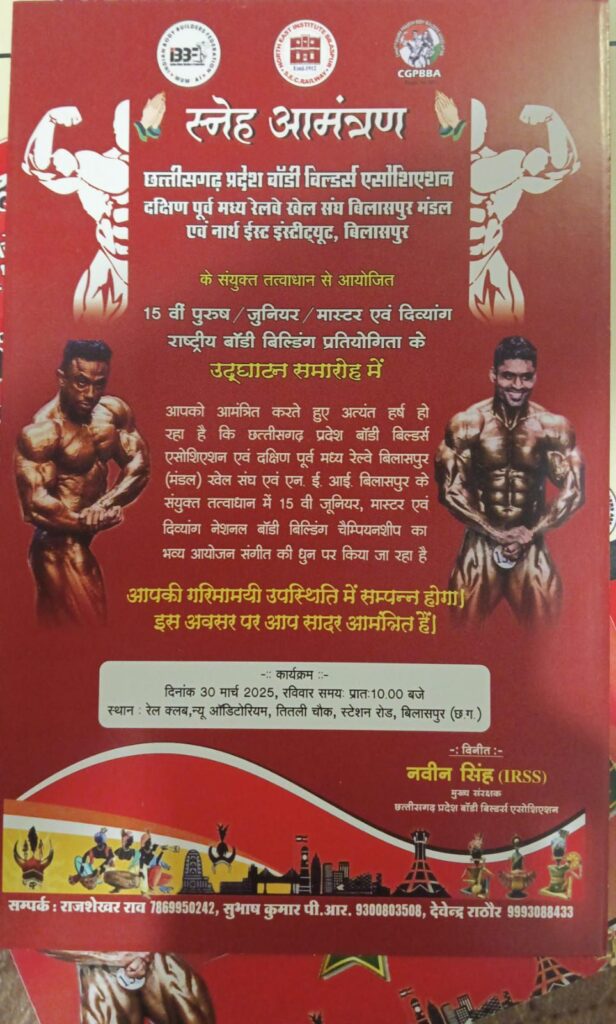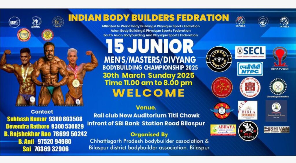 15वीं जूनियर मास्टर एवं दिव्यांग बॉडीबिल्डिंग राष्ट्रीय चैंपियनशिप जो कि छत्तीसगढ़ प्रदेश बॉडीबिल्डर संगठन एवं बिलासपुर जिला बॉडीबिल्डर संगठन नॉर्थ इंस्टीट्यूट बिलासपुर एवं मंडल रेलवे खेल संघ के द्वारा आयोजित की जा रही है जो 30 मार्च को 2025 को रेलवे के न्यू ऑडिटोरियम तितली चौक स्टेट बैंक के सामने जिसका भव्य आयोजन किया जा रहा है जिसमें भारत देश के 27 राज्यों की टीम एवं इसमें 350 खिलाड़ी एवं 50 ऑफिशल्स मैच का संचालन करेंगे इस प्रतियोगिता में खिलाड़ियों के रहने खाने एवं पुरस्कार की व्यवस्था छत्तीसगढ़ प्रदेश बॉडीबिल्डर से द्वारा की गई है संघ के संचालक श्री अवधेश त्रिवेदी एवं संघ के निर्देर्क्षक श्री नवीन सिंह एवं जिला बॉडीबिल्डिंग संघ के संरक्षक श्री रविंद्र सिंह ने लगातार प्रतियोगिता को सफल बनाने के लिए अपने निर्देश दिए।