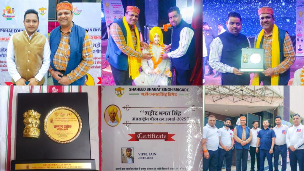 नई दिल्ली। नई दिल्ली के सिविल लाईन्स में स्थित शाह आड़िटोरियम में उड़ान एक पहल फाउंडेशन द्वारा शहीद भगत सिंह अन्तर्राष्ट्रीय गौरव अवार्ड 2025 का भव्य आयोजन किया गया। कार्यक्रम में देश-विदेश की जानी-मानी हस्तियों ने शिरकत की। समारोह में इंटरनेशनल अवार्डी व उत्तर प्रदेश सरकार द्वारा सम्मानित वरिष्ठ पत्रकार विपुल जैन बागपत को शहीद भगत सिंह अन्तर्राष्ट्रीय गौरव अवार्ड 2025 से इंटरनेशनल हयूमन राईट प्रोटेक्शन काउंसिल के फाउंडर व चेयरमैन डाक्टर टीएम ओंकार द्वारा पुरस्कृत किया गया।