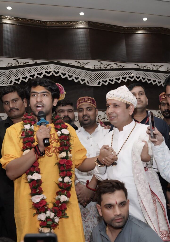 बिलासपुर में प्रथम प्रवास के दौरान बागेश्वर धाम के विश्व प्रसिद्ध संत एवं कथावाचक पंडित धीरेन्द्र कृष्ण शास्त्री जी ,सिंधी समाज के विश्व विख्यात भगवान झूलेलाल साईं के पवित्र मंदिर श्री सिन्धु अमरधाम आश्रम, चकरभाठा कैंप में पधारे।
