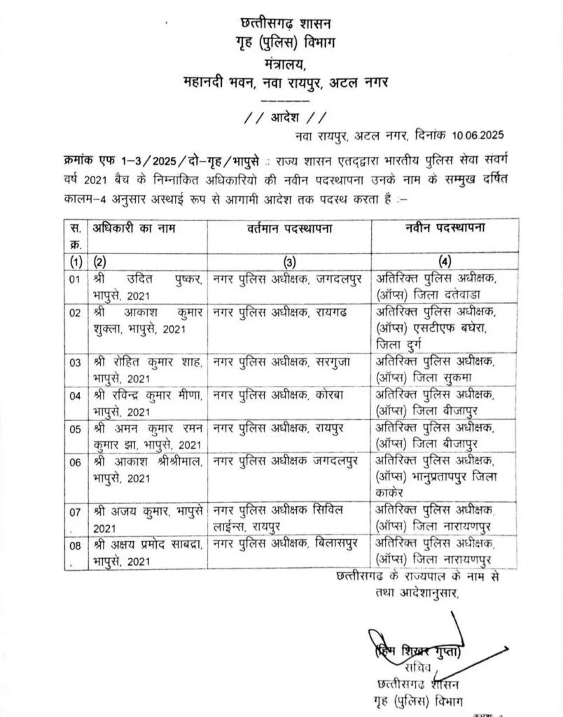 राज्य शासन ने 2021 बैच के आठ आईपीएस अधिकारियों की नवीन पदस्थापना करते हुए उन्हें सीधे एएसपी (ऑप्स) पदों पर बस्तर के नक्सल प्रभावित इलाकों में तैनात किया है। यह पहली बार है जब राज्य पुलिस सेवा (SPS) के बजाय इन पदों पर सीधे आईपीएस अधिकारियों को जिम्मेदारी दी गई है।