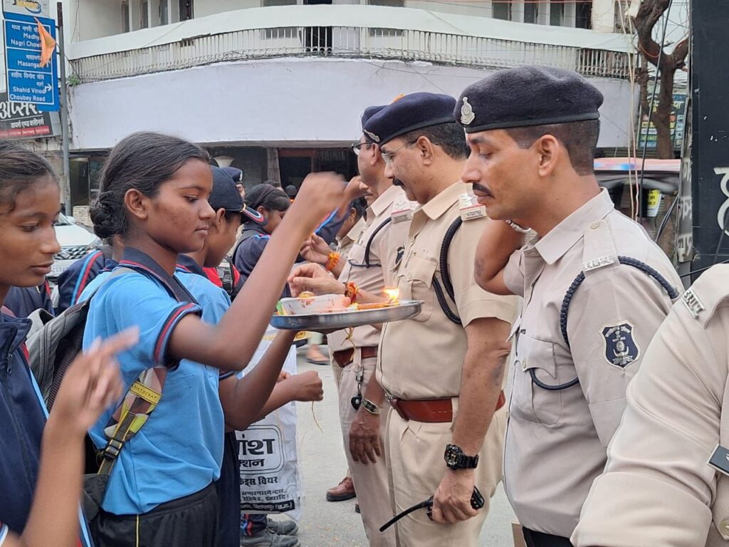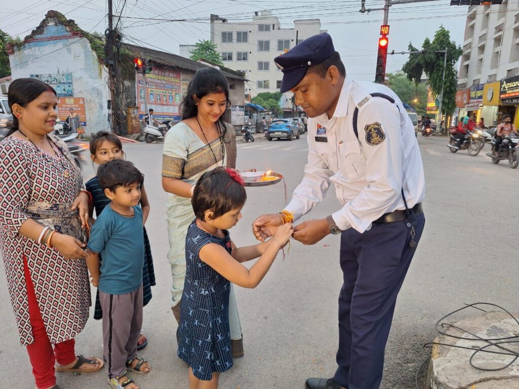 इसी तरह पुलिस जवान जो चौक चौराहे पर रक्षा बंधन जैसे पर्व के दौरान सुरक्षा व्यवस्था में तैनात रहे उनको भी महिला बच्चों द्वारा स्नेह पूर्वक राखी बाँधी गई जो लगातार हर पर्व उत्सव कानून व्यवस्था में प्रतिदिन शहर की सुरक्षा में तैनात जवानों को चाहे ट्रैफिक पुलिस हो या थाना चौकी में पदस्थ होकर पॉइंट पेट्रोलिंग और अन्य ड्यूटी में शहर की सुरक्षा में महत्वपूर्ण ज़िम्मेदारी निभाते हैं, महिला बच्चियों द्वारा रक्षा बंधन के पूर्व रक्षा सूत्र बाँधकर एक मार्मिक और पवित्र रिश्ता बनकर पुलिस अधिकारी कर्मचारी का सम्मान बढ़ाए ।