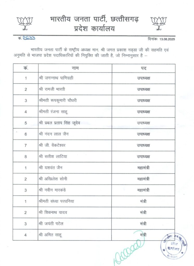 छत्तीसगढ़ भाजपा की नई कार्यकारिणी घोषित नए चेहरे को मिलना देखा