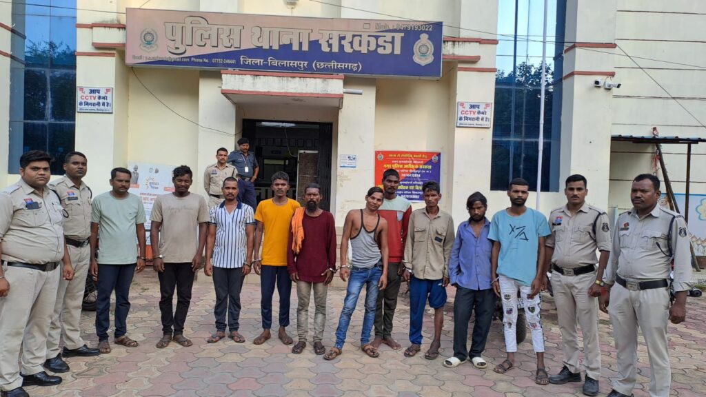 मामले का संक्षिप्त विवरण इस प्रकार है कि वरिष्ठ पुलिस अधीक्षक महोदय बिलासपुर रजनेश सिंह(भापुसे) द्वारा क्षेत्र में अशांति फैलाने वाले असामाजिक तत्व के बदमाश व्यक्तियों के विरूद्ध धरपकड़ कर वैधानिक कार्यवाही करने निर्देशित किया गया है, जिसके पालन में अति. पुलिस अधीक्षक शहर, बिलासपुर राजेन्द्र जायसवाल, सी.एस.पी. सरकण्डा सिद्धार्थ बघेल के मार्गदर्शन एवं दिशा निर्देशन में आज दिनांक 31.08.2025 को को विशेष अभियान चलाकर थाना प्रभारी निरी. निलेश पाण्डेय के नेतृत्व में टीम तैयार कर थाना के अलग-अलग क्षेत्रों में चेकिंग अभियान चलाया गया, चेकिंग के दौरान चिंगराजपारा, रपटा चौक चांटीडीह एवं अशोक नगर सरकण्डा में झूण्ड बनाकर उपद्रव करने वाले 9 बदमाशों सैय्यद सद्दाम अली, जयसिंह राजपूत, गोलू कुमार गंधर्व, रोशन धु्रव, दिनेश निर्मलकर, कृष्ण कुमार कैवर्त्य, नवल वर्मा, परमेश्वर उर्फ पुक्की केंवट, सागर साहू, एवं प्रहलाद मराठा को पकड़ा गया जिनके विरूद्ध प्रतिबंधात्मक धाराओं के तहत् कार्यवाही किया गया। चेकिंग दौरान पकड़े गये उक्त आरोपियों में आरोपी परमेश्वर उर्फ पुक्की केंवट, सागर साहू एवं प्रहलाद मराठा थाना सरकण्डा में दर्ज अपराध क्रमांक 1051/25 का फरार होना पाये जाने से विधिवत् गिरफ्तार किया गया, एवं सभी आरोपियों को न्यायालय पेश किया गया है।