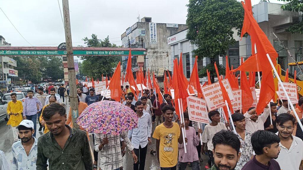 सोमवार को भारी बारिश के बीच भी बड़ी संख्या में लोग नूतन चौक से रैली निकाल कर कलेक्टर कार्यालय तक पहुंचे। रैली के दौरान लोग “राम नाम” के भजन गाते और हनुमान चालीसा का पाठ करते हुए महामाया चौक और नेहरू चौक से गुजरते हुए कलेक्ट्रेट पहुंचे। वहां लोगों ने जमीन पर बैठकर भजन-कीर्तन किया और प्रशासन के खिलाफ जमकर नारेबाजी की।