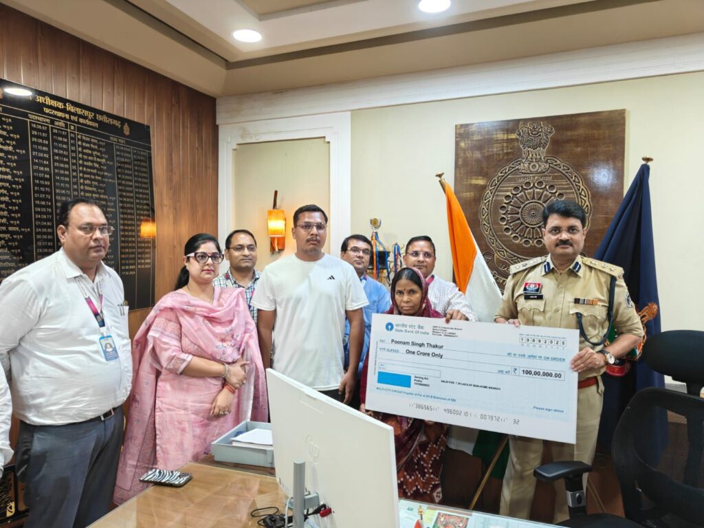 सड़क हादसे में जान गवाने वाले मृतक आरक्षक 558 स्वर्गीय रामनारायण सिंह के नामिनी पत्नि श्रीमती पूनम सिंह ठाकुर एवं पुत्र सुरेन्द्र सिंह ठाकुर को वरिष्ठ पुलिस अधीक्षक बिलासपुर रजनेश सिंह, और भारतीय स्टेट बैंक के शाखा प्रबंधक द्वारा आज दिनांक को 1 करोड़ रूपये का चेक दिया गया।