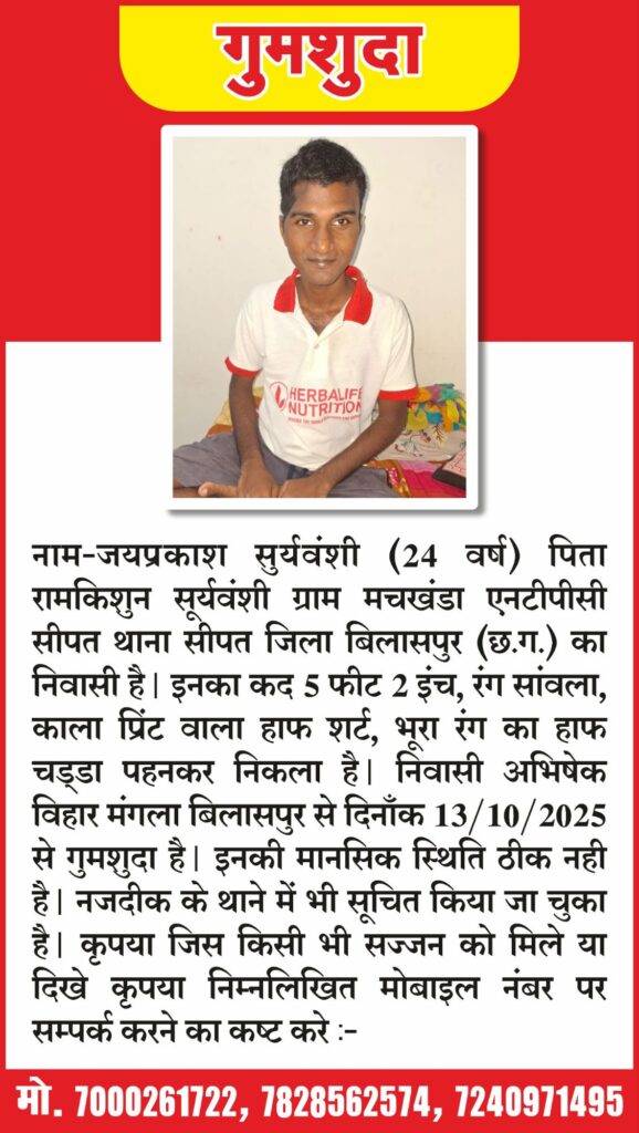 बिलासपुर। ग्राम मचखंडा निवासी 24 वर्षीय युवक जयप्रकाश सूर्यवंशी जिसकी मानसिक स्थिति ठीक नहीं है वहां गांव से रहस्यमय ढंग से कहीं गायब हो गए हैं जिसकी तलाश में परिजनों ने सभी संभावित स्थानों और रिश्तेदारों के यहां उसकी तलाश की, लेकिन उसका कोई पता नहीं चल पाया,तब उन्होंने निराशा वश नजदीकी पुलिस थाने में जाकर उनकी गुमशुदा होने की सूचना पुलिस को दी ,पुलिस को सूचना मिलते ही जांच शुरू कर दि है लेकिन अभी तक युवक का कोई पता नहीं चल पाया है घर वाले और पुलिस अपने-अपने स्तर में खोजबीन कर रही हैं घर वालों ने आम जनों से विनम्र निवेदन की है कि किसी भी सज्जन व्यक्ति को वह दिखे या उनके बारे में पता चले तो नजदीकी थाने में या परिवार वाले से संपर्क करने की अपील की है।