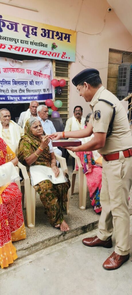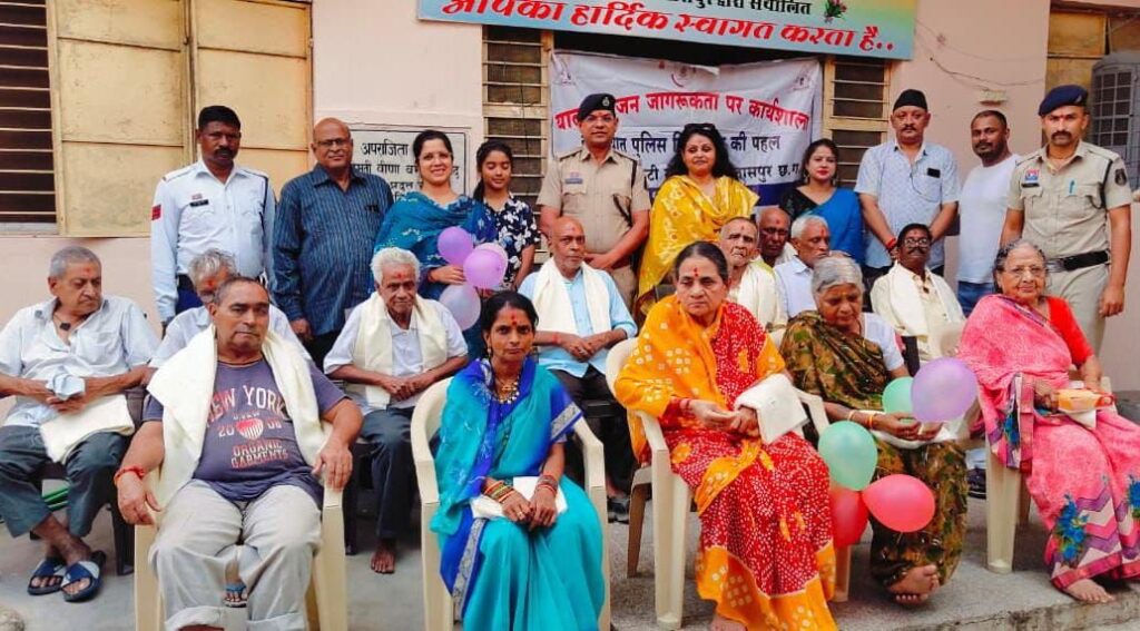 कि बुजुर्ग मां-बाप की देखभाल और सेवा सुश्रुषा हम सब की प्राथमिक जिम्मेदारी एवं नैतिक कर्तव्य है। शासन के द्वारा बुजुर्ग माता-पिता के जिम्मेदारियां के निर्वहन के संबंध में विधिक प्रावधान के सम्बंध में भी आम नागरिकों को मीडिया के माध्यम से संदेश प्रेषित किया गया है कि कोई भी परिवार अपने बुजुर्ग सदस्यों को किसी भी स्थिति में परिवार से अलग ना करें अपितु इस उम्र में उन्हें शारीरिक और मानसिक सहयोग की आवश्यकता होती है जिसकी पूर्ति परिवार ही कर सकती है अतः परिवार में ऐसा परिवेश स्थापित की जाए कि बुजुर्गों को किसी भी स्थिति में उम्र की इस पड़ाव पर परिवार से अलग होने जैसी हालत निर्मित ना हो। इस अवसर पर अतिरिक्त पुलिस अधीक्षक यातायात रामगोपाल करियारे, यातायात विभाग के अन्य अधिकारी एवं कर्मचारी एवं स्वयं सेवी संस्था "स्वयं सिद्धा फाउंडेशन" के अध्यक्ष चंचल सलूजा, एवं सदस्य ज्योति मिश्रा, सरभजित कौर, शेखर सरकार व अन्य सामाजिक संगठन के सदस्यगण उपस्थित थे।