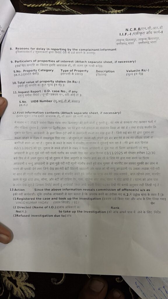 जिला – बिलासपुर – सिंधी समाज में उस समय हड़कंप मच गया जब अपने ही समाज की महिला के साथ मारपीट, छेड़छाड़ और जबरन दुकान कब्जाने का मामला सामने आया। पीड़िता सरिता पंजवानी ने सिटी कोतवाली थाने में लिखित शिकायत दर्ज कराई है।जानकारी के मुताबिक, सरिता पंजवानी की तीन मंजिला दुकान के ग्राउंड फ्लोर पर आरोपी प्रीतम अंडवानी पिछले सात वर्षों से जबरदस्ती कब्जा किए हुए है। कई बार समझाइश और समाजिक हस्तक्षेप के बावजूद आरोपी न तो दुकान खाली कर रहा था और न ही सम्मानजनक व्यवहार कर रहा था।