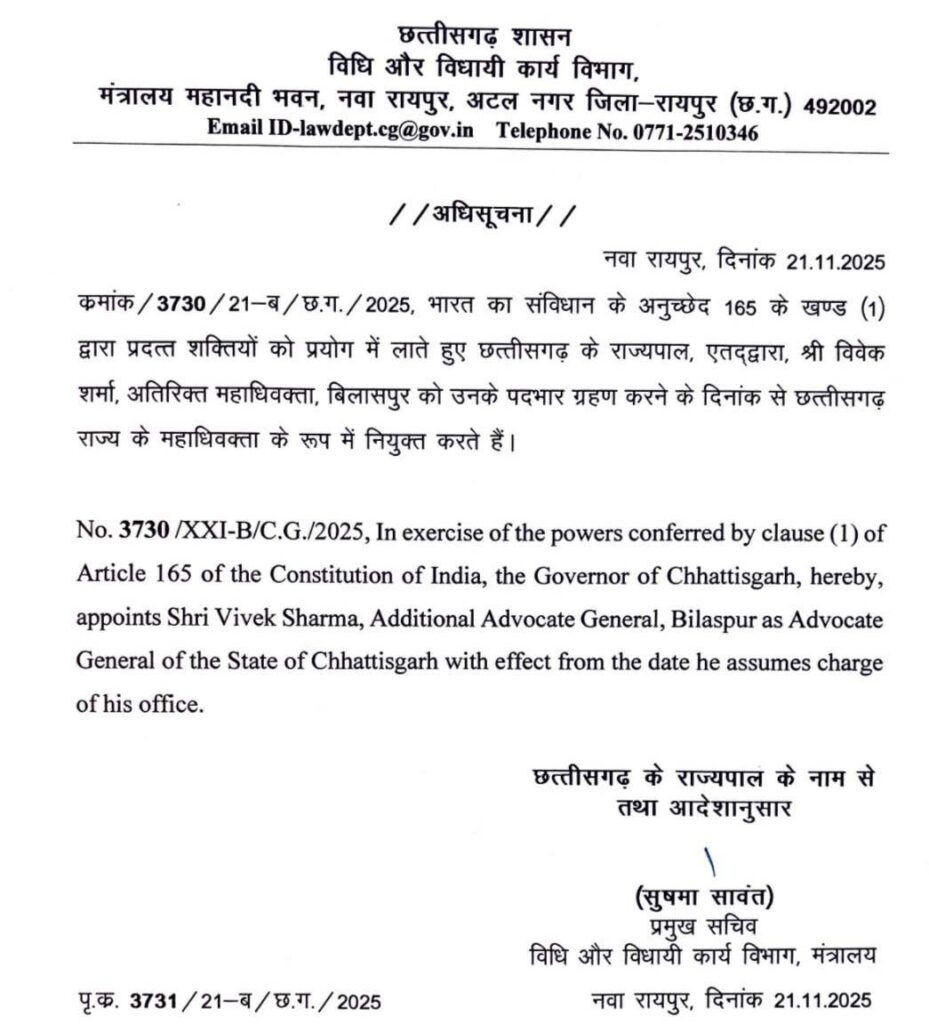 रायपुर।छत्तीसगढ़ सरकार ने राज्य के अतिरिक्त महाधिवक्ता रहे विवेक शर्मा को प्रदेश का नए महाधिवक्ता नियुक्त कर दिया है। इस संबंध में विधि और विधायी कार्य विभाग द्वारा आधिकारिक आदेश जारी किया गया।